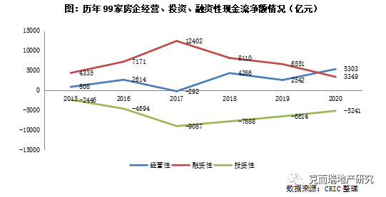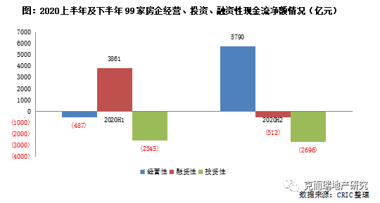 若從99家房企2020年上半年及下半年經(jīng)營、投資、融資性現(xiàn)金流凈額變化來看,可以看出大多數(shù)房企于下半年加強銷售回款、控制投資,經(jīng)營性現(xiàn)金流由負轉(zhuǎn)正至5790億元;而投資性現(xiàn)金流基本保持持平。與此同時,融資性現(xiàn)金流凈額呈現(xiàn)為凈流出,側(cè)面也說明房企加大了債務償還力度。