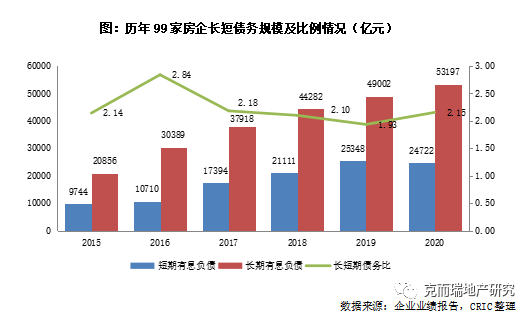 總有息負債微降,主要是由于短期有息負債的減少所致。2020年末99家房企的短期有息債24722億元,相比2019年下降了2%,為歷年來首次出現(xiàn)下滑,相比2020上半年大幅下降了10%。但值得注意的是,2020年末長期有息負債較2019年上升了9%至53197億元,此外較2020年中上升了3%。這主要由于下半年房企通過借新還舊,調(diào)整了債務結(jié)構(gòu)。在此背景下,房企2020年末的長短期債務比達2.15,較2019年及2020年中,均有明顯改善。