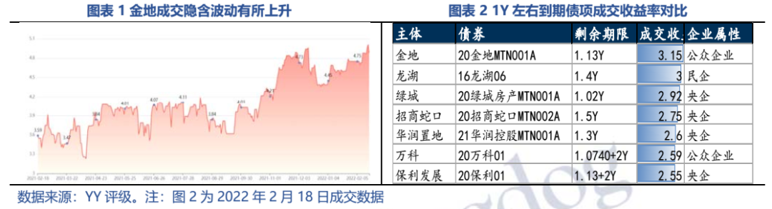 金地的YY隱含成交持續(xù)波動(dòng)上升,同期限債券的收益率要高于老對(duì)手“招保萬”和龍頭民企龍湖,二級(jí)估值的走弱反映市場(chǎng)對(duì)金地的擔(dān)憂有所增加。