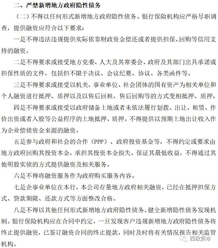在城投平臺的非標融資業務中,目前比較難處理的是融資主體和融資產品架構的問題,其中因城投平臺本身與地方政府有無法割裂的聯系,因此在融資層面如何確保城投平臺的融資不違反15號文是首先要解決的問題,以下先看看15號文中關于新增政府隱性債務的限制性規定: