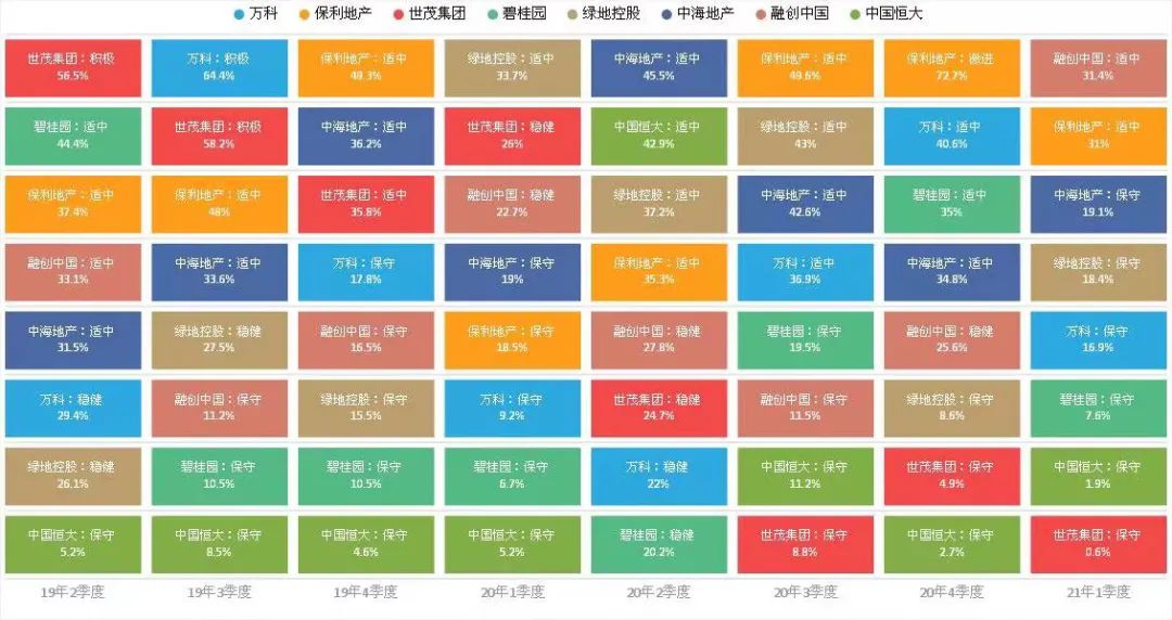 以最近被質疑保守的中海來講其拿地曲線也是波動的過去兩年時間里基本保持在適中狀態部分季度保持在保守狀態