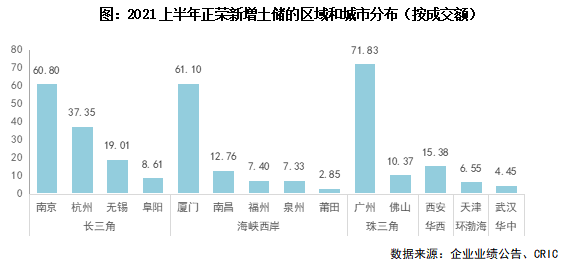 2021上半年正榮投資相對穩健,購地節奏較前期略有加快。期內于廈門、南京、無錫、西安等14個城市獲取24個項目,并首入杭州和廣州,新增土儲建面355.64萬平。土地成交價325.78億元,權益土地款同比增長19.4%至146.79億元,按金額計,權益拿地銷售比0.33,全口徑拿地銷售比升至0.4,高于TOP30同期均值0.34,但整體投資力度仍處40%的政策紅線內。