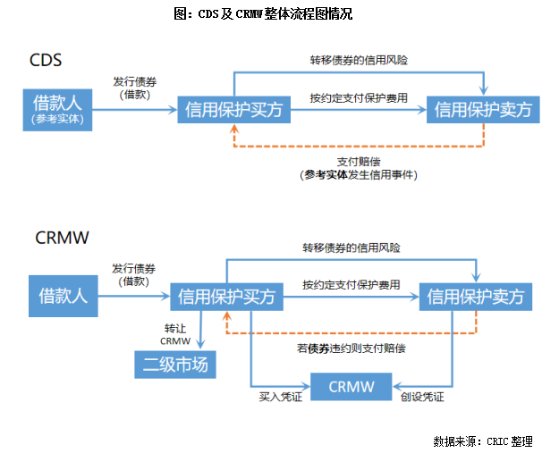 具體來看,此次提及的CDS及CRMW,在交易流程中,信用保護買方需要定期向信用保護賣方支付一定的費用,若參照實體或標的債務沒有發生違約,則信用保護賣方沒有任何的現金流出。而若參照實體或標的債務出現信用問題,信用保護買方將有權利將債券以面值遞送給信用保護賣方,從而規避風險。