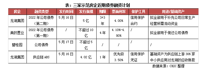 5月16日,龍湖集團宣布發行2022年第二期境內公司債,發行規模達5億,期限3+3年,發行利率4%,該債券為民營房企公司債券首單創設信用保護合約。而同日,美的置業跟進龍湖,宣布發行10億2+2年無擔保公司債券。此外碧桂園方面也表示,近期擬發行不超過5億的公司債券,詢價區間4.50%-5.00%,證金公司與中信建投證券擬為該債券創設信用保護合約,保護期限不超過1年。