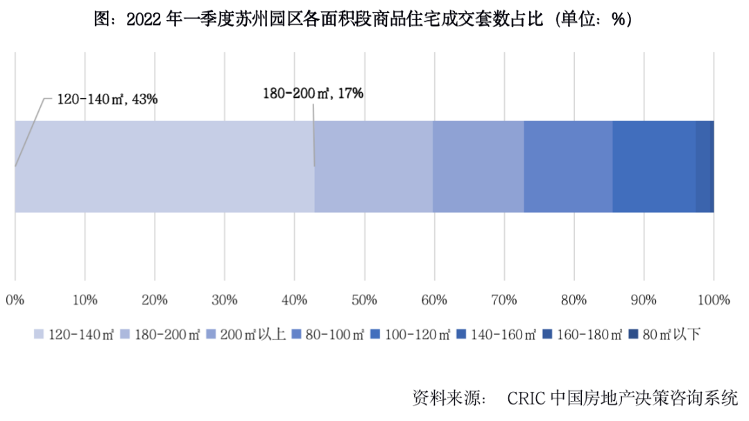 對核心區域,園區和獅山板塊,外地購房者置換周期的縮短將加劇區域內熱銷項目認籌難度。但當前蘇州二套房首付80%的限貸政策尚未松動,因此改善市場不會出現較大波動。以園區為例,一季度120-140平方米首改面積段成交占比43%最高,其次是180-200平方米終改。因此新政后預計首改和終改產品競爭將更加劇烈。