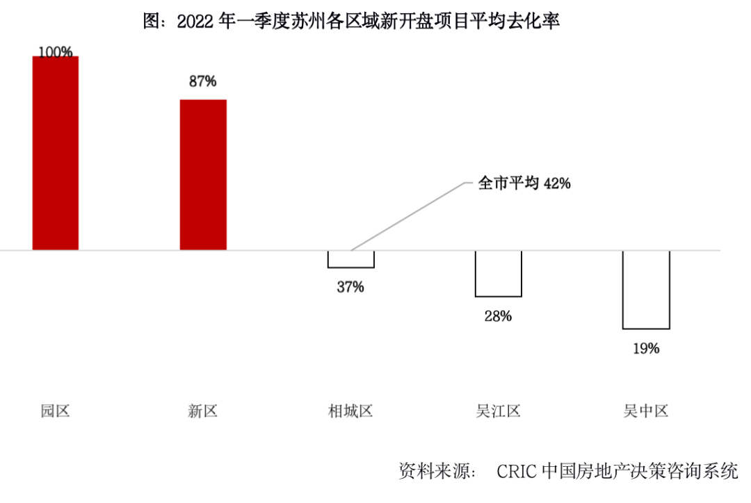 蘇州,一季度樓市下行之中最大特點是區域間嚴重分化。一季度園區核心板塊去化最好,2個價格倒掛項目首開“日光”;新區去化率87%,在售項目去化率均60%以上。而絕大多數郊區板塊則成交慘淡,在售項目普遍做出降價8折以上優惠,但去化率仍不足40%,其中吳中區僅19%。