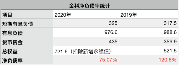 從財務報表中分析來看,金科的有息負債應該為976.7億元,貨幣資金為435億元,計算凈負債率時,總權(quán)益數(shù)據(jù)735億元,應該是減去了2020年8月之后新增的13.42億元永續(xù)債(監(jiān)管要求),即總權(quán)益為721.58億元。