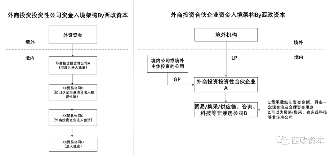需注意的是,以通過(guò)搭建外商投資投資性合伙企業(yè)方式進(jìn)行資金入境時(shí)(見上述右圖),需注意下設(shè)的B公司需能承載結(jié)匯資金金額,比如需具有相應(yīng)的現(xiàn)金流;企業(yè)性質(zhì)可以為非投資性的貿(mào)易/集采/供應(yīng)鏈類的公司或咨詢、科技類等非涉房公司。