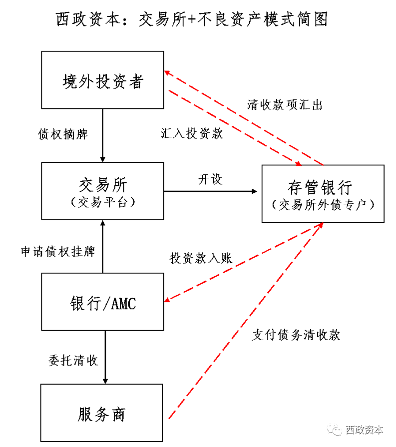 對(duì)于擬參與境內(nèi)不良資產(chǎn)處置(地產(chǎn)項(xiàng)目)投資的外資機(jī)構(gòu)而言,目前亦可通過(guò)部分金融資產(chǎn)交易所進(jìn)行AMC或銀行掛牌的不良資產(chǎn)的跨境轉(zhuǎn)讓。在該模式中,交易所代境內(nèi)轉(zhuǎn)讓人向外匯局辦理逐筆事前備案,進(jìn)行外債登記;并由交易所開立外債專用賬戶代收交易保證金及對(duì)價(jià),代為辦理外匯收付及稅收申報(bào)手續(xù)等。其基本架構(gòu)如下: