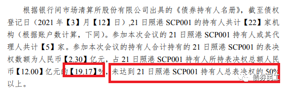 4、2021年3月16日,“”第一次持有人會議的持有人所持有的表決權數額未達到本期債務融資工具總表決權的三分之二以上,持有人會議無效。主承銷商在3月19日也公告,