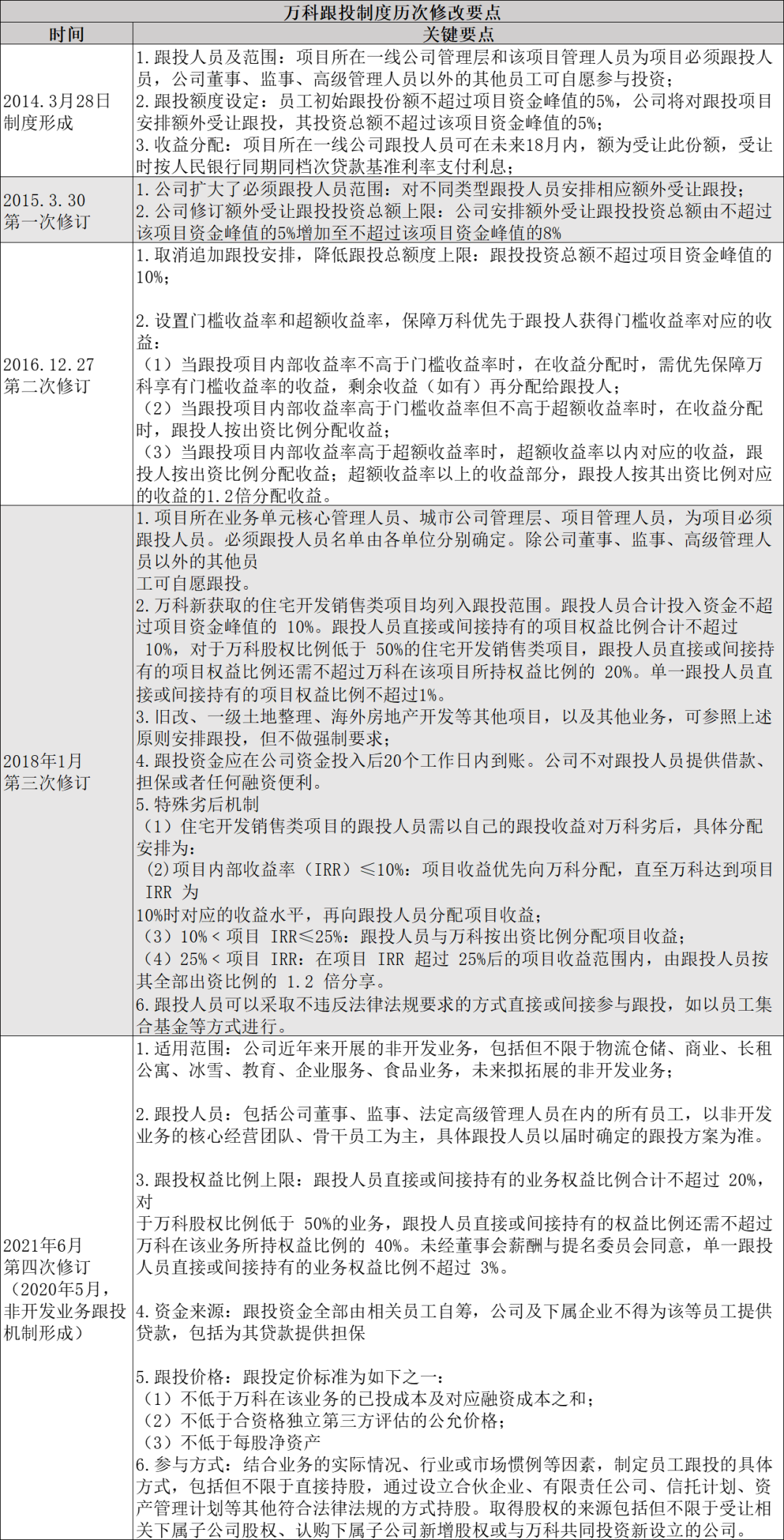 2018年,萬科跟投機制修改再次強調(diào)了員工跟投總額不超過項目資金峰值的10%,且跟投人員跟投資金應(yīng)在公司資金投入后20-40個工作日內(nèi)到賬,公司不對跟投人員提供借款、擔(dān)保或者任何融資便利。
