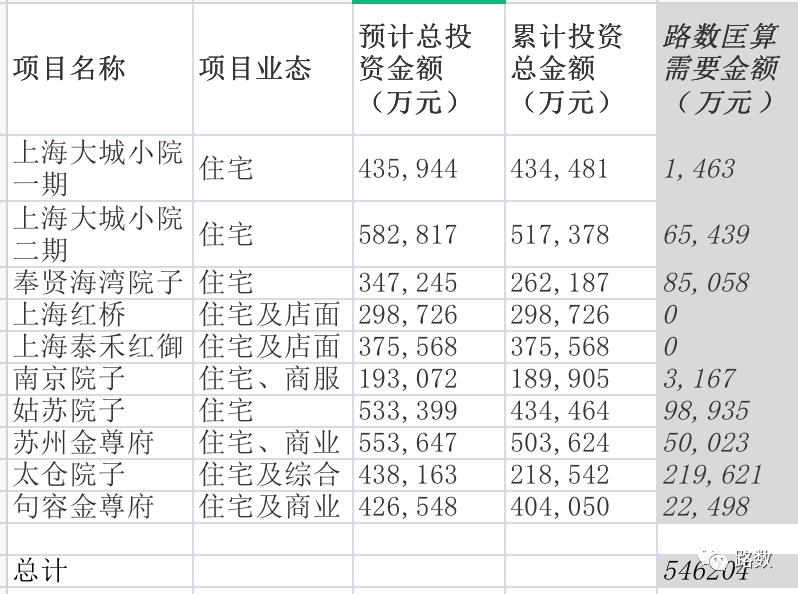 按照表格所列項目初步匡算,泰禾在上海和蘇州的7個項目到交付時所需要的資金總計約54億。(隨著工期延長等,利息不斷資本化,實際的投入也會增加)