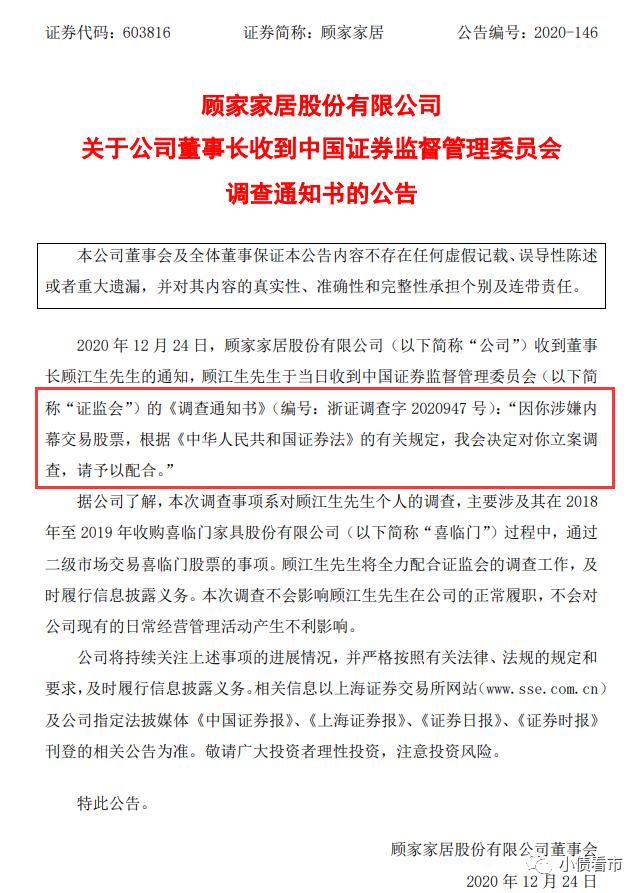 12月24日,顧家家居(603816.SH)公告稱,因涉嫌內(nèi)幕交易股票,董事長(zhǎng)顧江生收到中國(guó)證券監(jiān)督管理委員會(huì)調(diào)查通知書(shū) 。