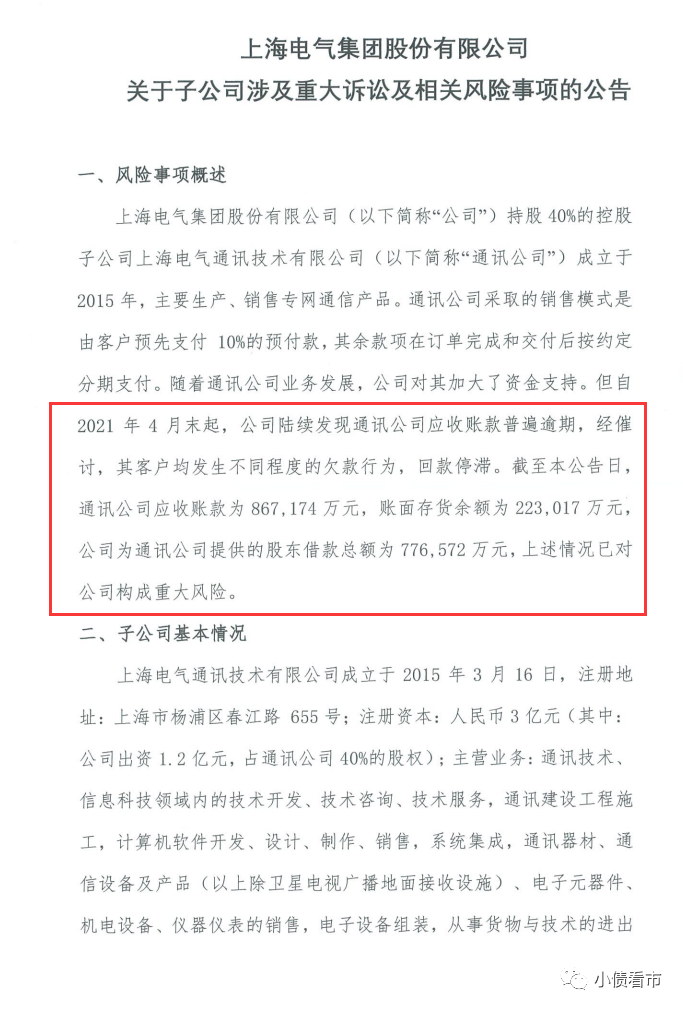 5月30日晚,上海電氣(601727.SH)公告稱,公司合并報表范圍內(nèi)的控股子公司上海電氣通訊技術(shù)有限公司(以下簡稱“通訊公司”)應(yīng)收帳款普遍逾期,存在大額應(yīng)收賬款無法收回的風(fēng)險。