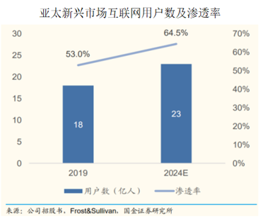 根據(jù) Frost&Sullivan 數(shù)據(jù),亞太新興市場(chǎng)的互聯(lián)網(wǎng)用戶在 2019 年達(dá)到 18 億人,滲透率僅為 53%,接近一半的人口尚未接入互聯(lián)網(wǎng),預(yù)計(jì) 2024 年互聯(lián)網(wǎng)用戶數(shù)將增長至 23 億人,滲透率提升至 64.5%。