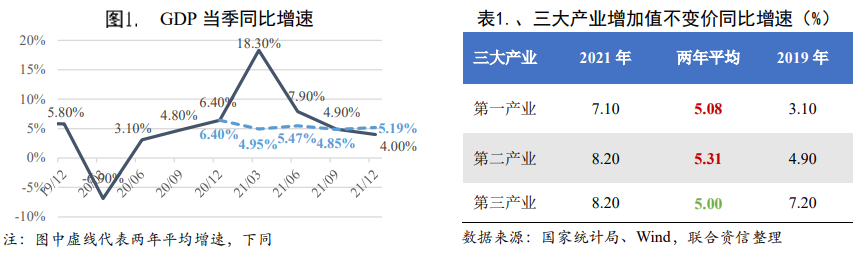 2021 年,在國際環(huán)境趨于復(fù)雜嚴(yán)峻、全球疫情不斷蔓延、大宗商品價(jià)格上漲、供應(yīng)鏈緊張、我國宏觀 政策回歸常態(tài)化等背景下,我國經(jīng)濟(jì)上半年持續(xù)復(fù)蘇,三季度經(jīng)濟(jì)增長有所放緩,四季度小幅改善。經(jīng)初步核算,2021年我國國內(nèi)生產(chǎn)總值114.37萬億元,按不變價(jià)計(jì)算,同比增長 8.10%,兩年平均增長[1]5.11%。分季度來看,GDP 當(dāng)季同比增速在基數(shù)影響下逐季回落。從兩年平均增速來看,上半年我國經(jīng)濟(jì)穩(wěn)定修復(fù);三季度 GDP 增速明顯回落,主要受供給端約束和內(nèi)生動(dòng)能不足的共同影響;隨著保供穩(wěn)價(jià)和助企紓困政策有力推進(jìn),供給端限電限產(chǎn)的約束有所改善,四季度經(jīng)濟(jì)增長有所加快。