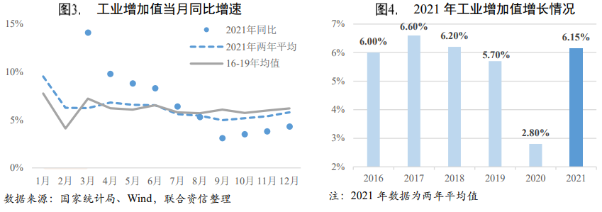 工業(yè)生產(chǎn)基本恢復(fù)到疫情前水平,上半年表現(xiàn)強(qiáng)勢(shì),三季度觸底后四季度小幅回升。2021年全國規(guī)模以上工業(yè)增加值同比增長9.60%,兩年平均增長6.15%,基本接近疫情前水平。2021年上半年工業(yè)增加值當(dāng)月同比增速在基數(shù)的影響下呈下行趨勢(shì),剔除基數(shù)因素后,1-6月當(dāng)月兩年平均增速除了3月外均高于2016-2019年同期均值水平,上半年我國工業(yè)生產(chǎn)表現(xiàn)較為強(qiáng)勢(shì)。三季度受國際大宗商品價(jià)格不斷上漲、能耗雙控以及缺芯等供應(yīng)鏈緊張問題影響,工業(yè)生產(chǎn)同比增速與兩年平均增速變化趨勢(shì)均有所回落。隨著能源供應(yīng)保障有所加強(qiáng)、穩(wěn)定市場(chǎng)價(jià)格等政策措施成效顯現(xiàn)、國外疫情反彈,四季度工業(yè)生產(chǎn)呈現(xiàn)小幅回升態(tài)勢(shì),但仍低于2016-2019年同期均值水平。