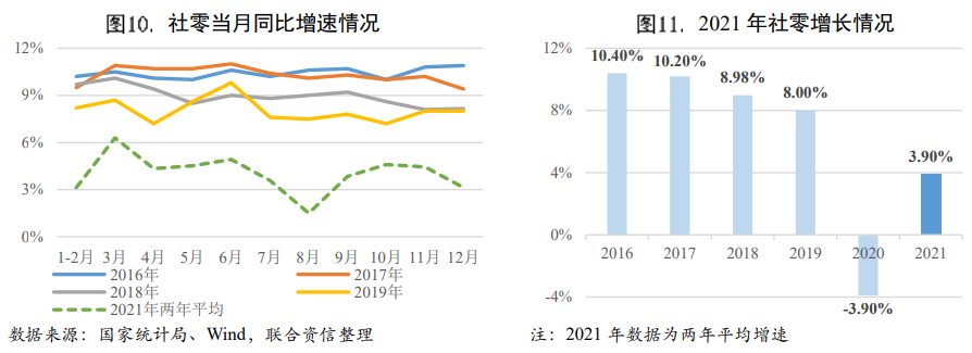多點(diǎn)散發(fā)疫情對(duì)消費(fèi)沖擊較大。2021年我國社會(huì)消費(fèi)品零售總額(以下簡稱“社零”)44.08萬億元,同比增速12.50%,兩年平均增速3.98%,與疫情前水平差距仍然較大。疫情前2019年消費(fèi)的月度增速大概在7%左右的水平,而2021年消費(fèi)兩年平均增速則基本維持在4%~5%的區(qū)間,8月是全年的低點(diǎn),僅為1.50%,消費(fèi)仍有較大的恢復(fù)空間。消費(fèi)疲弱的短期影響因素主要有疫情多點(diǎn)發(fā)生、居民消費(fèi)與出行活動(dòng)的減少,而疫情以來一直表現(xiàn)較好的網(wǎng)上實(shí)物商品銷售兩年平均增速在2021年下半年連續(xù)出現(xiàn)下滑,從7月的16.65%持續(xù)下行至12月的13.39%,或反映出消費(fèi)疲弱不僅是由于短期疫情因素的沖擊。