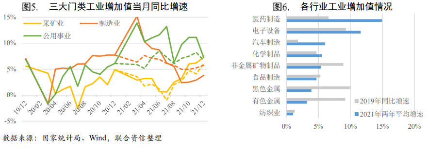三大門類均實(shí)現(xiàn)較快增長。2021年,采礦業(yè)、制造業(yè)以及電力、熱力、燃?xì)饧八a(chǎn)和供應(yīng)業(yè)增加值同比分別增長5.30%、9.80%、11.40%,兩年平均增速分別為2.87%、6.55%、6.60%。主要行業(yè)[2]方面,醫(yī)藥制造業(yè)、計(jì)算機(jī)、通信和其他電子設(shè)備制造業(yè)以及汽車制造業(yè)受出口帶動(dòng)2021年工業(yè)增加值兩年平均增速較高,但受芯片、電池等供應(yīng)鏈短缺影響,下半年特別是8月汽車制造產(chǎn)能擴(kuò)張承壓;而黑色、有色金屬冶煉及延壓加工業(yè)和非金屬礦物制品業(yè)工業(yè)增加值兩年平均增速較2019年下降較大,主要是限電限產(chǎn)等措施對(duì)鋼鐵、有色和水泥等高耗能行業(yè)產(chǎn)能負(fù)面影響較大,其中鋼鐵工業(yè)增加值兩年平均增速繼續(xù)下滑,除了供給端的限制外,還受到需求端地產(chǎn)降溫的影響。