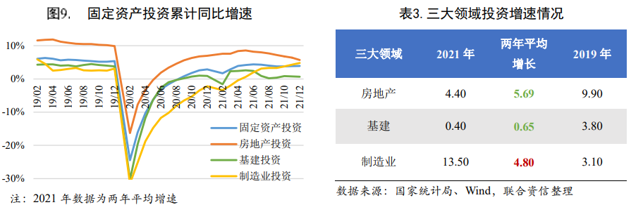 固定資產(chǎn)投資修復(fù)緩中趨穩(wěn)。2021年全國固定資產(chǎn)投資(不含農(nóng)戶)54.45萬億元,同比增長4.90%;兩年平均增長3.90%,較疫情前水平(2019年為5.40%)仍有一定差距。固定資產(chǎn)投資結(jié)構(gòu)進(jìn)一步優(yōu)化:制造業(yè)投資繼續(xù)加速,支撐固定資產(chǎn)投資向上修復(fù);而房地產(chǎn)和基建投資增速延續(xù)下行,對(duì)固定資產(chǎn)投資的拉動(dòng)作用進(jìn)一步下降。