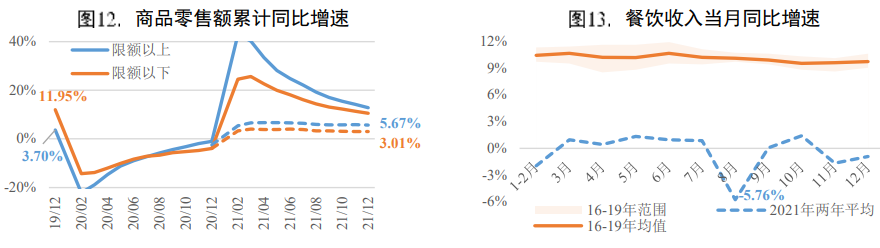 限額以下商品零售和接觸性服務(wù)仍是消費(fèi)的主要拖累。2021年商品零售額同比增長11.80%,兩年平均增長4.51%,不及疫情前水平(2019年為7.90%)。商品零售與疫情前差距主要體現(xiàn)在限額以下的部分:2021年限額以下商品零售額兩年平均增速僅為3.01%,與疫情前2019年的增速水平(11.95%)相差較大。限額以上商品零售額兩年平均增速均為正值,汽車銷售上半年表現(xiàn)強(qiáng)勢(shì),而自二季度以來受芯片供應(yīng)短缺以及排放標(biāo)準(zhǔn)升級(jí)切換期等影響較大,汽車零售額兩年平均增速多次落入負(fù)值區(qū)間。餐飲收入受疫情沖擊較大,2021年餐飲收入同比增長18.60%,兩年平均下降0.55%,餐飲消費(fèi)規(guī)模仍不及疫情前水平。餐飲收入等接觸性消費(fèi)由于對(duì)疫情變化更為敏感,整體波動(dòng)較大且較疫情前水平差距較大,仍有較大的恢復(fù)空間。
