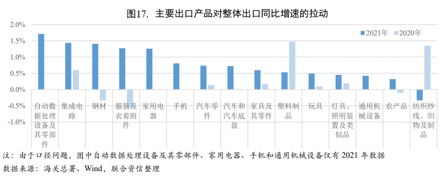 海外產(chǎn)需缺口、出口替代效應(yīng)以及低基數(shù)等因素支撐我國出口高增長。2021年主要經(jīng)濟(jì)體PMI高位運(yùn)行,全球經(jīng)濟(jì)持續(xù)恢復(fù),海外需求旺盛但產(chǎn)需依然存在較大缺口,加之東南亞疫情反復(fù)導(dǎo)致的出口替代作用,共同支撐我國出口維持高景氣度。但海運(yùn)領(lǐng)域出現(xiàn)的集裝箱運(yùn)力緊張、運(yùn)價(jià)高漲問題對(duì)出口產(chǎn)生了一定的負(fù)面影響。三季度以來出口價(jià)格上漲對(duì)出口金額的貢獻(xiàn)度上升,集成電路、手機(jī)和家用電器等受大宗商品漲價(jià)明顯的行業(yè),出口均表現(xiàn)出量減價(jià)增的特點(diǎn)。從主要出口產(chǎn)品對(duì)整體出口同比增速的拉動(dòng)來看,自動(dòng)數(shù)據(jù)處理設(shè)備及其零部件、集成電路依然是出口的最大拉動(dòng)項(xiàng);紡織紗線、織物及制品由于上年基數(shù)較高,對(duì)出口造成負(fù)向拉動(dòng)。