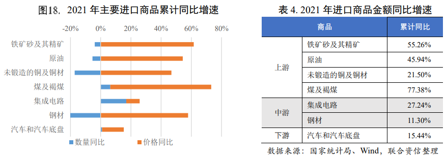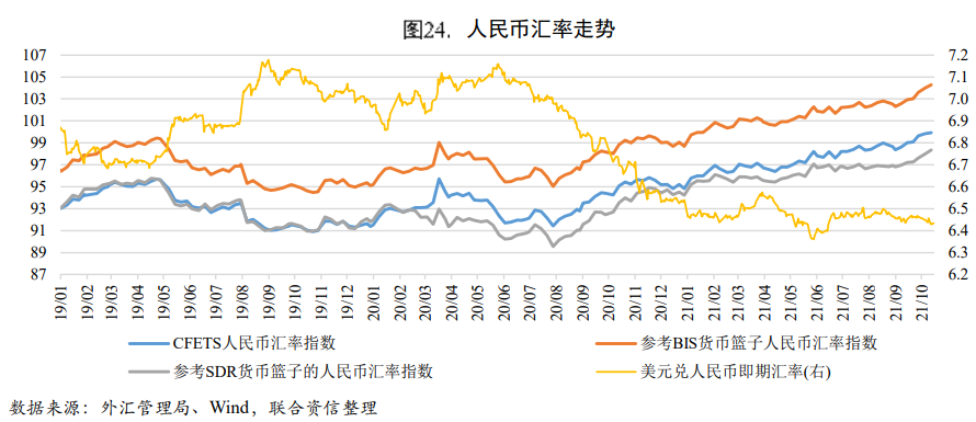 國際大宗商品漲價(jià)、人民幣升值等多重因素帶動(dòng)進(jìn)口金額增長。價(jià)格因素支撐主要進(jìn)口商品金額高增長:鐵礦砂及其精礦、原油和未鍛造的銅及銅材、煤及褐煤、鋼材以及汽車和汽車底盤進(jìn)口金額增長主要由價(jià)格大幅增長拉動(dòng);僅集成電路的數(shù)量增速高于價(jià)格增速,表明數(shù)量因素對(duì)金額增長的貢獻(xiàn)大于價(jià)格拉動(dòng)。多數(shù)商品呈現(xiàn)量減價(jià)揚(yáng)的特點(diǎn),國際大宗商品價(jià)格的上漲抑制了部分國內(nèi)需求。此外,2021年以來人民幣匯率三大指數(shù)同步提升,人民幣升值一定程度上也對(duì)擴(kuò)大進(jìn)口產(chǎn)生了積極作用。