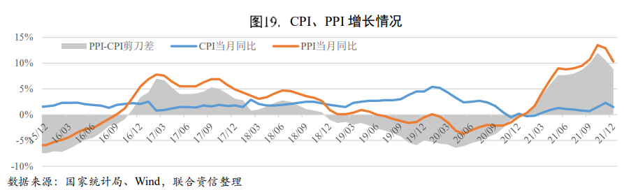 PPI-CPI剪刀差大幅擴(kuò)大。2021年1-10月,PPI與CPI剪刀差持續(xù)擴(kuò)大,成本上漲難以轉(zhuǎn)嫁,中下游企業(yè)利潤承壓。隨著年底PPI漲幅有所回落,PPI-CPI剪刀差小幅收窄,上游生產(chǎn)價(jià)格繼續(xù)上升動(dòng)能減弱,價(jià)格加快向下游行業(yè)傳導(dǎo),中下游企業(yè)的成本壓力或?qū)⒌玫揭欢ǔ潭鹊木徑狻?br/>