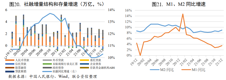 2021年,社融增速整體呈現(xiàn)高位回落的態(tài)勢(shì),貨幣供應(yīng)量、社會(huì)融資規(guī)模的增速與名義經(jīng)濟(jì)增速基本匹配。截至12月末,社融存量余額為314.13萬億元,同比增長10.30%,比2020年末低3個(gè)百分點(diǎn)。2021年新增社融規(guī)模31.35萬億元,其中人民幣貸款是主要支撐項(xiàng);政府債券同比大幅下降,但顯著高于2019年水平,發(fā)行錯(cuò)期效應(yīng)使得政府債券支撐社融增速在年底觸底回升;企業(yè)債券融資同比大幅下降,與2019年同期基本持平,企業(yè)債券的融資回歸常態(tài);非標(biāo)融資規(guī)模大幅壓降,是拖累新增社融規(guī)模的主要因素。