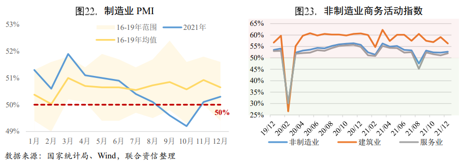 2021年,我國制造業(yè)PMI除9、10月外均位于榮枯線上,整體呈現(xiàn)出上半年景氣度較高、下半年景氣度較低的態(tài)勢(shì)。上半年制造業(yè)PMI波動(dòng)在51%左右的水平,高于2016-2019年同期的均值,上半年制造業(yè)景氣度較高;而下半年制造業(yè)PMI則在榮枯線上下波動(dòng),回落至低于2016-2019年同期的均值的區(qū)間,下半年制造業(yè)景氣度有所回落。分企業(yè)類型來看,小型企業(yè)生產(chǎn)經(jīng)營面臨的壓力仍然較大,景氣水平偏弱。12月,制造業(yè)PMI回升0.20個(gè)百分點(diǎn)至50.30%,延續(xù)小幅回升態(tài)勢(shì)。