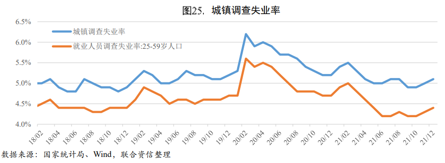 就業(yè)形勢(shì)總體基本穩(wěn)定。2021年城鎮(zhèn)新增就業(yè)1045萬人,完成全年目標(biāo)任務(wù)的95%;城鎮(zhèn)調(diào)查失業(yè)率均值為5.10%,低于全年5.50%左右的調(diào)控目標(biāo)。從結(jié)構(gòu)看,重點(diǎn)群體就業(yè)情況有所改善。2021年下半年,就業(yè)主體人群(25-59歲人口)失業(yè)率一直穩(wěn)定在4.50%以下,低于前兩年同期水平;2021年末,全國農(nóng)民工規(guī)模達(dá)到2.93億人,較上年末增加691萬人,恢復(fù)至疫情前2019年末水平。