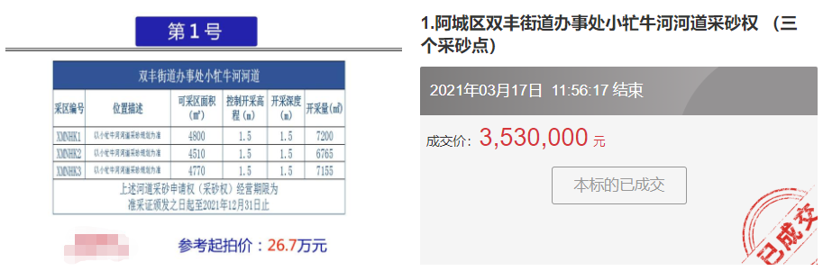 本標(biāo)的是位于哈爾濱市阿城區(qū)雙豐街道辦事處小牤牛的河河道采砂權(quán),其起拍價(jià)格為267,000元,歷經(jīng)2小時(shí)的激烈競價(jià)之后以3,530,000元的價(jià)格成交,實(shí)現(xiàn)了3,263,000元的溢價(jià),溢價(jià)率高達(dá)1200%。這般激烈競價(jià),真是讓人大開眼界!