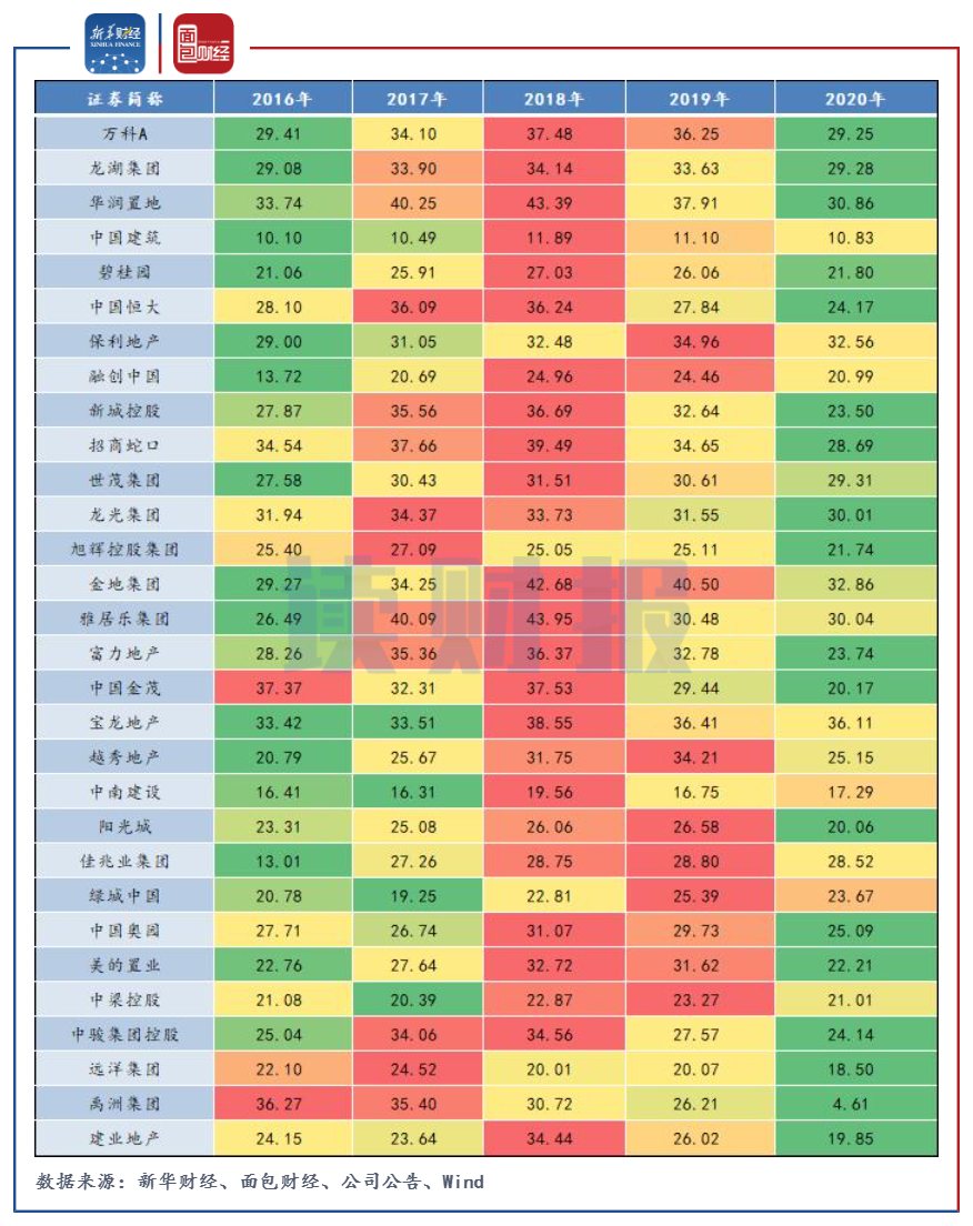新華財經和面包財經研究員以滬、深、港三大股票交易所主要上市房企為樣本,統計了市值排名前三十的企業(以下統稱為“整體房企”)。從統計結果看,整體房企報表毛利率從2018年以來逐步下滑:2020年整體房企毛利率為24.2%,較2018年高點下滑7.4個百分點;凈利率為12%,較2018年下滑2.05個百分點,行業整體利潤率中樞下行。
