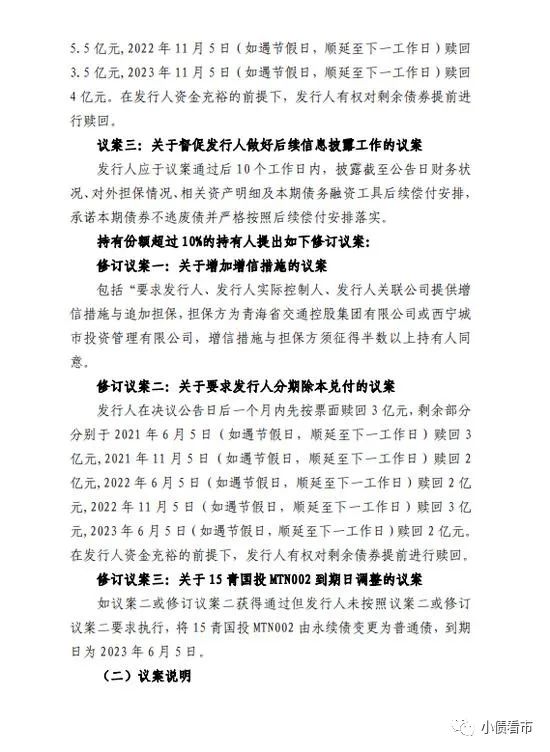 值得注意的是,修改議案中提到在資金充裕前提下,發(fā)行人有權(quán)對(duì)剩余債券提前進(jìn)行贖回。如果發(fā)行人未執(zhí)行分期付息,將“15青國(guó)投MTN002”由永續(xù)債變更為普通債,到期日為2023年6月5日。
