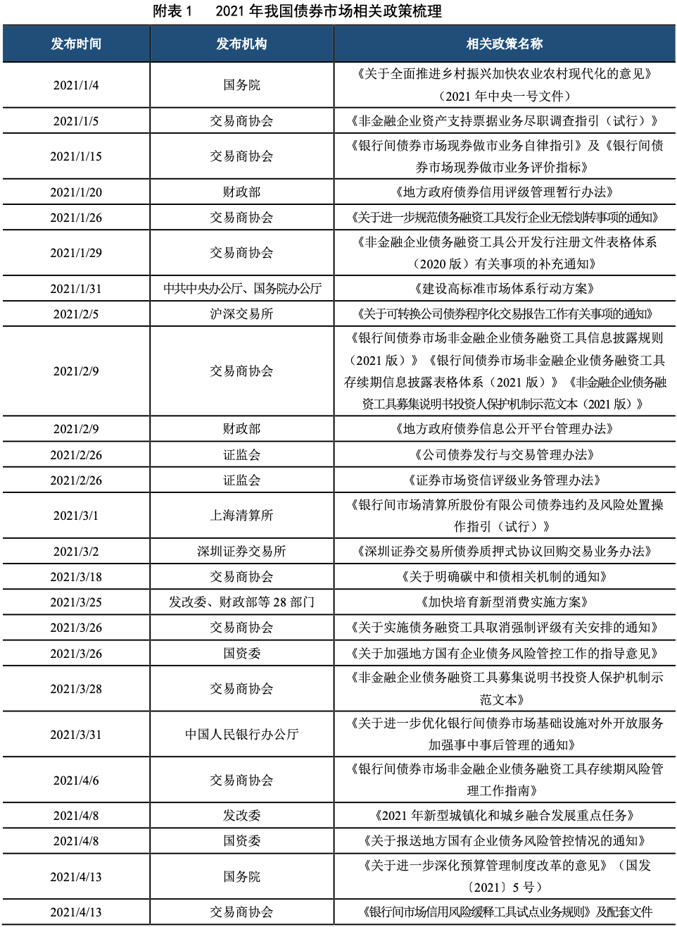 2021年,我國經濟持續穩定恢復,但仍面臨需求收縮、供給沖擊、預期轉弱三重壓力,同時,外部環境更趨復雜嚴峻和不確定,經濟下行壓力有所較大。在此背景下,監管部門出臺多項舉措,支持綠色、科技等領域債券定向擴容,完善債市體制機制,推進債券市場統一監管,加快債券市場對外開放,推動信用評級行業高質量發展,持續加強債券市場風險管控,完善違約處置機制。總體來看,我國債券市場債券高質量發展穩步推進,市場化、法治化、國際化程度顯著提升。