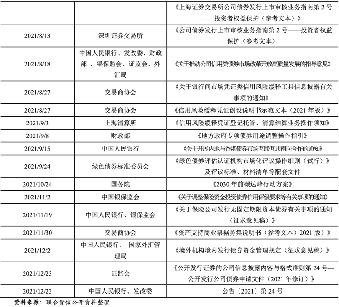 完善信息披露制度。為進一步落實2020年末央行等三部委發布的《公司信用類債券信息披露管理辦法》,銀行間和交易所市場均發布相關系列文件,完善信息披露制度。銀行間市場,2月9日,交易商協會修訂《銀行間債券市場非金融企業債務融資工具信息披露規則(2021版)》等系列文件,進一步強化信息披露主體與人員責任,完善細化定期報告中非財務信息披露內容,規范違約處置及投資者保護機制披露要求,強化定向發行產品規則約束,有助于進一步規范信息披露義務人的信息披露行為,提高信息披露質量。交易所市場,4月29日,上交所修訂《上海證券交易所公司債券發行上市審核規則適用指引第1號——申請文件及編制》,重點對償債能力相關的主要披露內容提出要求。同時,發布《上海證券交易所公司債券自律監管規則適用指引第1號——公司債券持續信息披露》,首次由交易所層面對定期報告內容與格式進行自律規范,確立了信息披露基本原則和要求,披露導向上更加側重償債能力分析,同時進一步明晰了重大事項披露標準。兩指引的發布明確了公司債券發行上市審核和持續監管階段的信息披露要求,對市場主體的信息披露行為有較強的規范和指導意義。同日,深交所發布《深圳證券交易所公司債券發行上市審核業務指南第1號——募集說明書參考格式》等業務指南,對深交所公司債券發行上市審核和存續期階段的信息披露內容進行列示,有助于規范公司債券發行人信息披露行為,提高公司債券信息披露水平。此外,9月6日,上交所正式推出信息披露直通車制度。信息披露直通車是指市場主體通過上交所登記和上傳信息披露文件并直接在上交所官方網站披露的信息披露方式,具有完善業務覆蓋、強化事后監管、實施分類監管、優化業務流程等特點,有助于提高信息披露的及時性和便利性,提升公司債券及資產支持證券的信息披露水平。12月23日,證監會發布《公開發行證券的公司信息披露內容與格式準則第24號—公開發行公司債券申請文件(2021年修訂)》,具體修訂內容包括:落實公開發行公司債券注冊制、結合《公司債券發行與交易管理辦法》修訂內容進行適應性修訂、結合債券市場監管實踐調整相關要求等。該文件有助于降低優質發行人的信息披露成本,提高公司債券融資效率。
