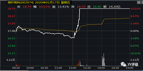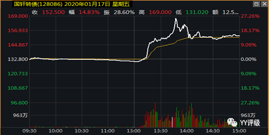 案例:2020年1月17日有消息傳出大眾擬收購國軒高科20%股份,下午開盤后股票迅速漲停封板,國軒轉(zhuǎn)債則是沖高后回落(較多轉(zhuǎn)債投資者獲利賣出)。此時若確認該利好較重大,國軒高科會進一步上漲,則可以買入國軒轉(zhuǎn)債建倉。事實上到收盤時國軒轉(zhuǎn)債的轉(zhuǎn)股溢價率仍為負,雖然未到轉(zhuǎn)股期,但負溢價無疑提供了更多安全邊際。