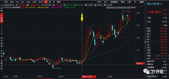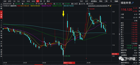 案例:2020年三季度的這輪股市上漲于7月1日加速啟動,上證綜指放量上漲突破3000點,銀行、保險等板塊估值修復(fù),蘇銀、浦發(fā)、光大等銀行轉(zhuǎn)債走出大陽線,此時若不想追高,又怕錯過行情,則可發(fā)現(xiàn)桐20轉(zhuǎn)債仍在110以下,福能轉(zhuǎn)債仍在106以下,均為優(yōu)質(zhì)標的且在安全價格,7月1日是這兩支轉(zhuǎn)債的極佳買點(當(dāng)然,7月1日對很多轉(zhuǎn)債都是好買點,但是經(jīng)歷了5月、6月的慘淡之后,轉(zhuǎn)債投資者的風(fēng)險偏好普遍較低,此時買入基本面好,價格又安全的標的是更現(xiàn)實的選擇)。