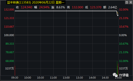 案例2:益豐轉(zhuǎn)債2020年6月22日上市,當(dāng)天開盤的轉(zhuǎn)股價值在117左右,作為藥房龍頭,在轉(zhuǎn)債市場具有稀缺性,上市當(dāng)天集合競價直接成交在130,觸發(fā)上交所臨停機制,到當(dāng)天14:57分恢復(fù)交易。一級投資者的出貨需求在最后3分鐘才得到釋放,價格被砸到125,對應(yīng)收盤時的轉(zhuǎn)股價值117,溢價率不足10%,是很好的買入時點。