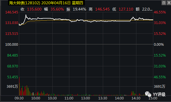 案例1:海大轉(zhuǎn)債2020年4月16日上市,按正股開盤價計算轉(zhuǎn)股價值為119.72,但轉(zhuǎn)債開盤后價格一度砸到將近127,量還不小。海大集團當(dāng)時的正股走勢很強,基本面也很好,這樣的優(yōu)質(zhì)標的,價格130以下,轉(zhuǎn)股溢價率10%以下,是一級投資者出貨才砸出來的機會。