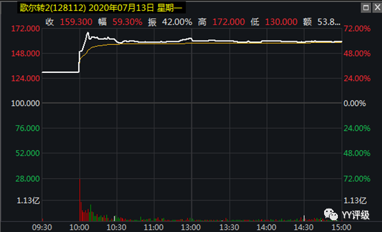案例:歌爾轉(zhuǎn)2于2020年7月13日上市,正是股市漲勢強勁的時候,正股是優(yōu)質(zhì)的蘋果概念股,不出意外地集合競價直接熔斷在130,10:00重新開始交易,此時轉(zhuǎn)股價值已經(jīng)到了145,加上市場給予優(yōu)質(zhì)轉(zhuǎn)債的溢價,轉(zhuǎn)債的價格有可能達到160以上,而10:00前下買單的投資者可以發(fā)現(xiàn),第一筆竟然成交在137.44,按當(dāng)天收盤價計算,盈利16%。與此類似,龍大轉(zhuǎn)債第一筆成交在131,欣旺轉(zhuǎn)債第一筆成交在133,均可當(dāng)天實現(xiàn)可觀盈利。