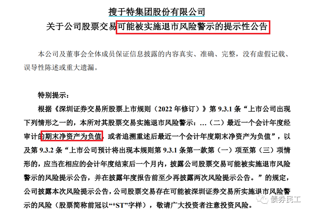 廣州高新投持有搜于特8.06%股份,為搜于特第二大股東。根據(jù)搜于特2022年3月12日披露的公告,由于預(yù)計(jì)公司2021 年末凈資產(chǎn)為負(fù)值,公司存在可能被實(shí)施退市風(fēng)險(xiǎn)警示的風(fēng)險(xiǎn)。