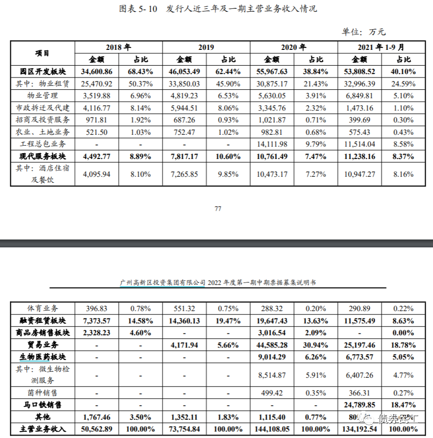 廣州高新投的實(shí)際控制人是廣州經(jīng)濟(jì)技術(shù)開發(fā)區(qū)管理委員會(huì),主體信用等級(jí)為AA+(中誠信國際、中證鵬元、東方金誠和上海新世紀(jì))。廣州高新投的業(yè)務(wù)范圍包括園區(qū)開發(fā)板塊、現(xiàn)代服務(wù)業(yè)板塊、融資租賃板塊、商品房銷售板塊和貿(mào)易業(yè)務(wù)板塊等。其中園區(qū)開發(fā)板塊是廣州高新投最重要的主營業(yè)務(wù)。從業(yè)務(wù)范圍來看,廣州高新投屬于典型的城投公司。