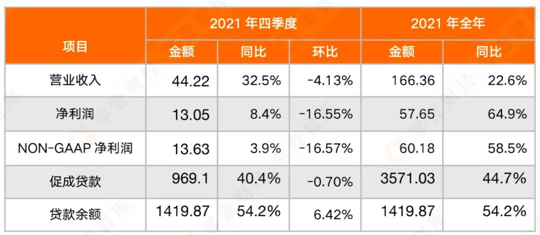 從貸款規模上看,360數科是目前國內最大的上市線上助貸平臺,且一直保持較高增速。2021年四季度,360數科促成貸款969.1億元,同比增長40.4%,環比略降0.7%;2021年全年促成貸款3571.03億元,同比增長44.7%,截至2021年底,貸款余額1319.87億元,同比增長54.2%,環比三季度末增長6.42%。