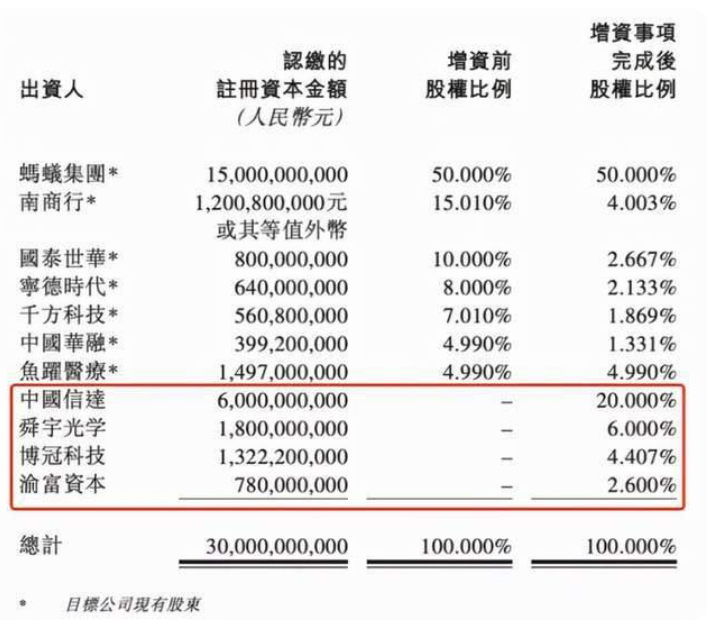 新股東中國信達、舜宇光學、博冠科技、渝富資本分別新增注冊資本60億元、18億元、13.222億元和7.8億元。