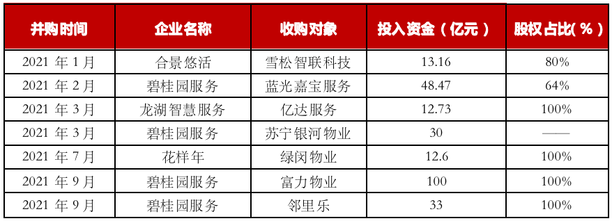 2021年以來,物管行業在經歷了階段性上市潮后加速發展,掀起收并購熱潮,且熱度由年初持續至今,僅11月前3天內就發生四起主要收購事件,交易金額超過25億元。頭部物管企業開始尋找合適收購機會,以收購全部或部分股權的方式擴大規模。