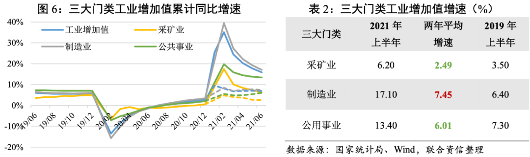 上半年投資三大領域依舊呈現“房地產>基建>制造業”的格局,三大領域兩年平均增長均未達到疫情前水平。其中上半年房地產開發投資是固定投資的主要支撐,但出現邊際減弱的趨勢,“三條紅線”、“限貸令”以及部分地區出臺的限售、限貸政策效果開始顯現;上半年基建投資低位運行,主要是受到上半年專項債推遲發行、財政資金支出緩慢的影響;上半年制造業投資兩年平均增速逐月提升態勢明顯,在信貸政策支持、產能利用率處于高位、效益不斷改善等有利于制造業投資恢復的多方面因素的支撐下,制造業投資加速修復。