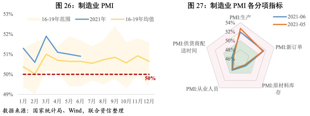 2021年上半年制造業PMI運行在51%左右,制造業生產擴張整體穩定。6月制造業PMI微降0.10個百分點至50.90%,制造業景氣有所回落。生產指數較上月回落,但仍位于榮枯線以上,主要是近期部分企業生產活動受到芯片、煤炭、電力供應緊張以及設備檢修等因素影響,生產擴張有所放緩;新訂單指數也位于榮枯線以上,且較上月小幅上升0.2個百分點,反映出市場需求保持增長。