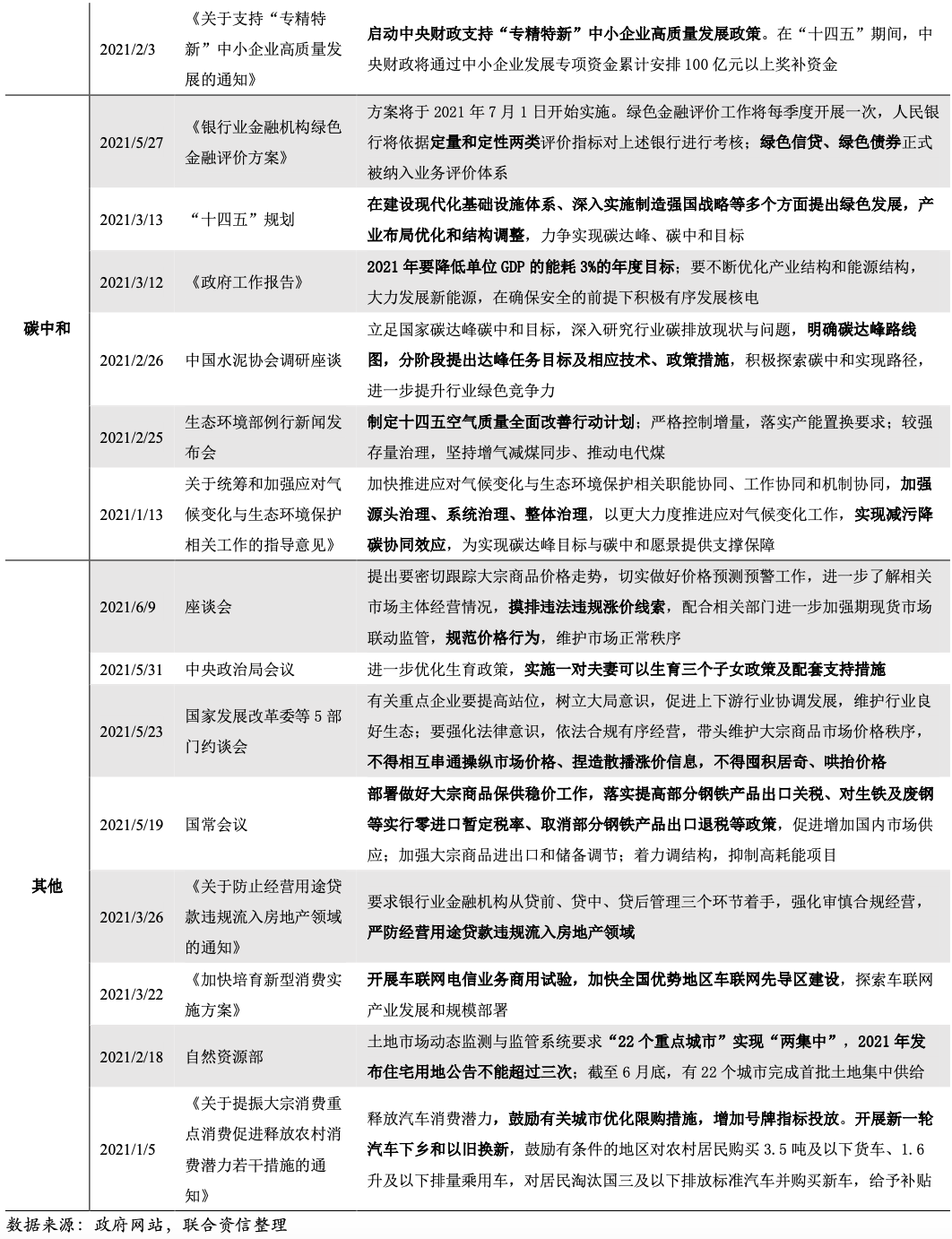 2021年以來,積極的財政政策突出強化“提質增效、更可持續”,在“穩增長”壓力較小的情況下,財政政策更加注重精準有效,財政部下發文件,對專項債券資金預算執行進度和績效目標實現情況進行“雙監控”,進一步提高了專項債的發行門檻,下半年將繼續聚焦支持實體經濟和促進就業,用好地方政府專項債等資金,推進重大工程、基本民生項目等重點建設。貨幣政策方面,上半年堅持穩健的貨幣政策,保持靈活精準、合理適度,穩字當頭,下半年貨幣政策還是以“穩”為主,更加注重支持中小微企業、勞動密集型行業。匯率方面,預計下半年將繼續“保持人民幣匯率在合理水平上波動”的政策。2021年以來中央層面出臺多項政策推動實現“碳中和”目標,預計下半年政策或將逐步落地。