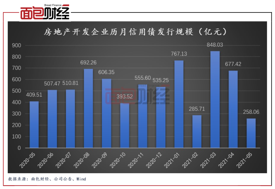 按照發行公告日口徑統計,2021年5月,國內房地產開發企業發行境內信用債合計融資258.06億元,環比下降61.91%,同比下降36.98%。